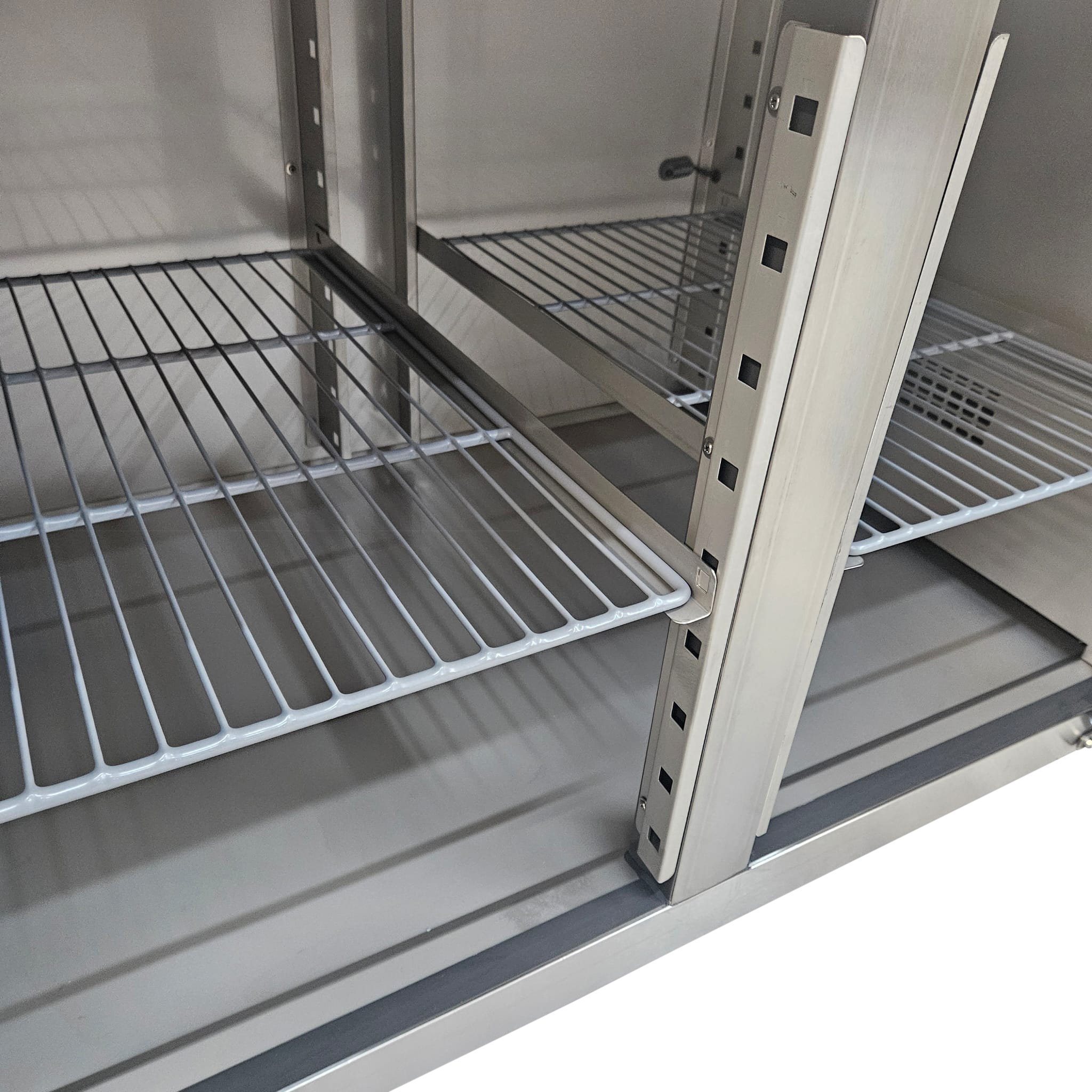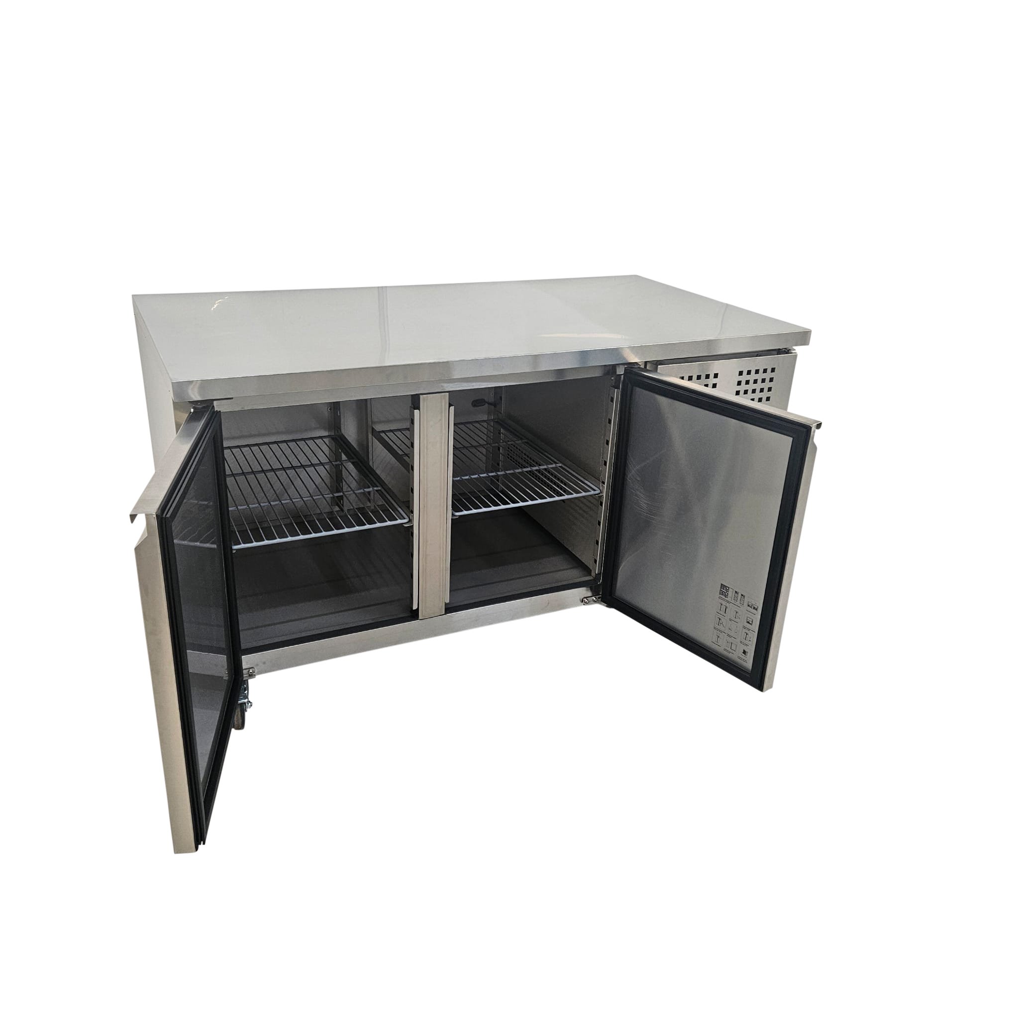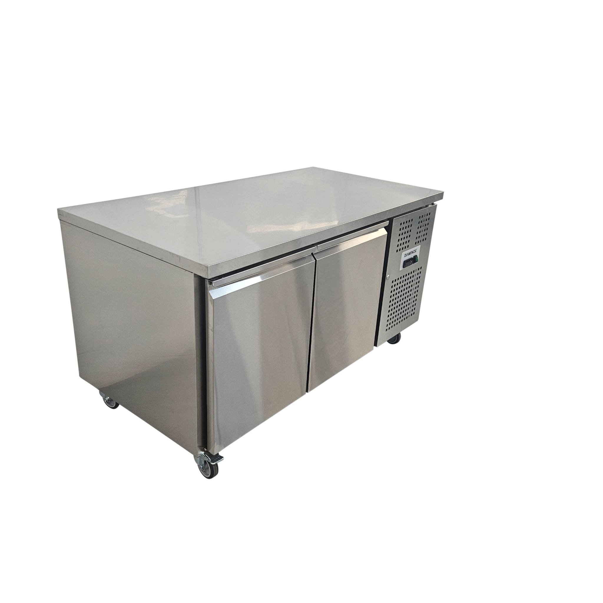 The powerful, efficient and hugely practical Diaminox double door counter bench fridge offers impressive commercial performance and reliability with a generous internal storage capacity. Designed for use in restaurants, takeaways, pizzerias and many more establishments. Ingredients can be stored on 2 sturdy shelves inside the fridge and then prepared for service on the stainless-steel worktop. The Diaminox worktop is not only ideal for food prep, but it can also be used as additional counter space if workspace is limited.