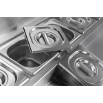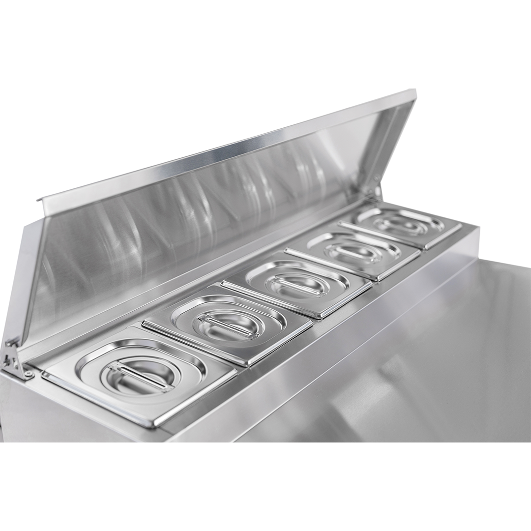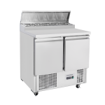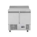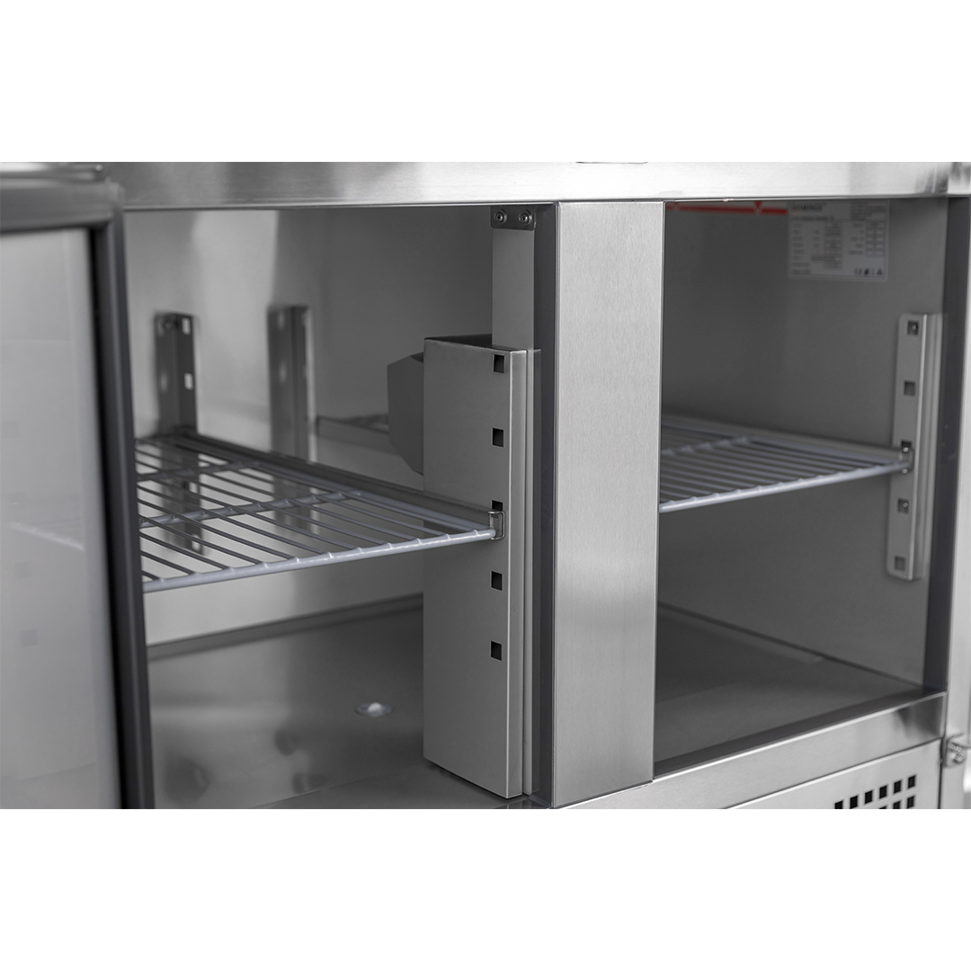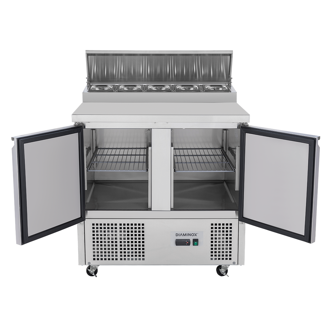 The Diaminox two door saladette prep counter brings together a raised chilled gastro topping section with a double hinged door refrigerated cabinet resulting in an organised food preparation area with everything you need during a busy service close to hand.