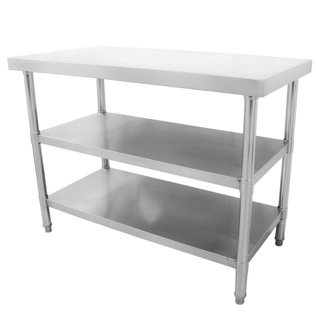 On top, the stainless steel surface is perfect for prepping food. Below, a Stainless steel undershelves provide a solid and dependable platform to store equipment and small appliances. The table is easy to assemble, and even easier to keep clean. It comes with four feet, but castor wheels are available separately (30326) if required.