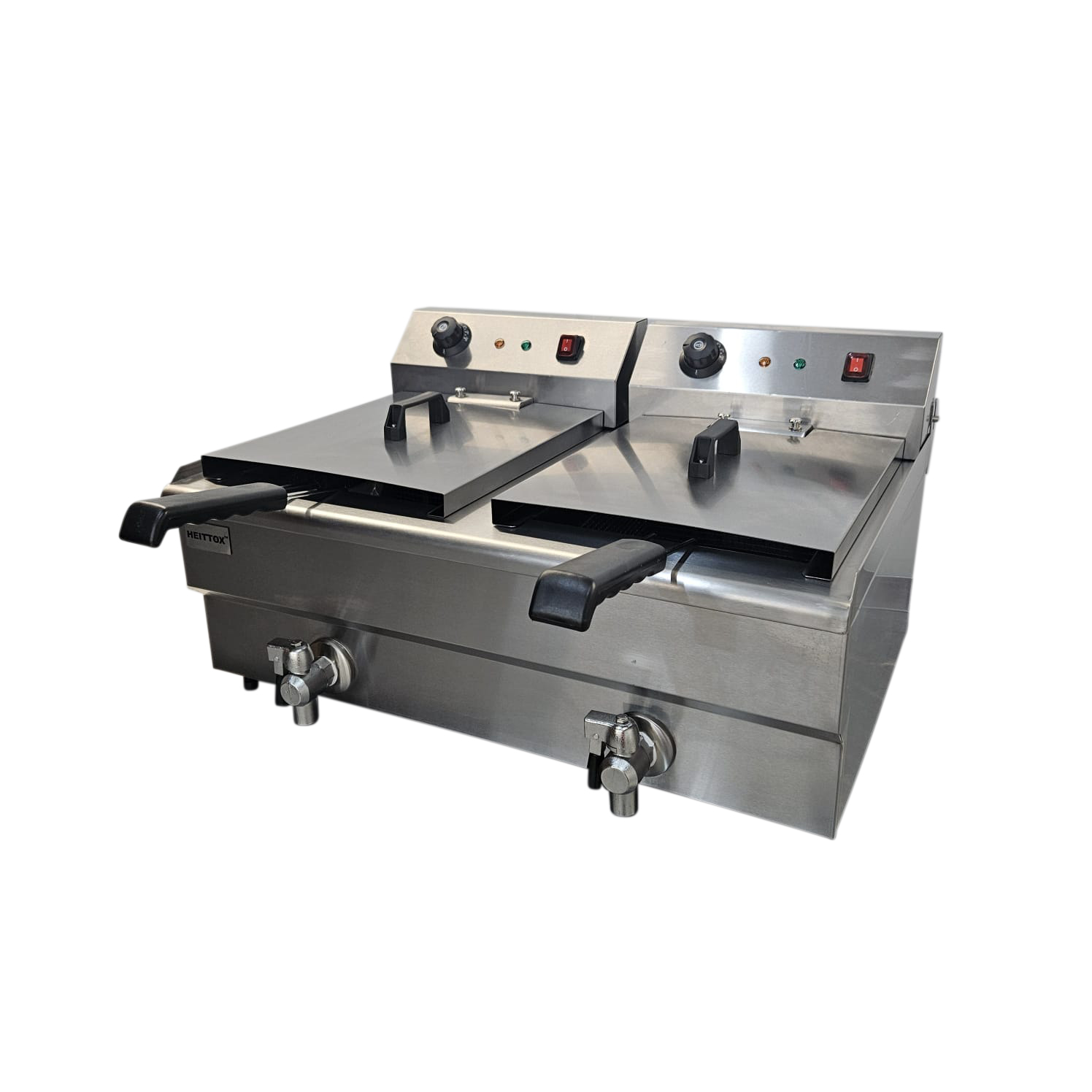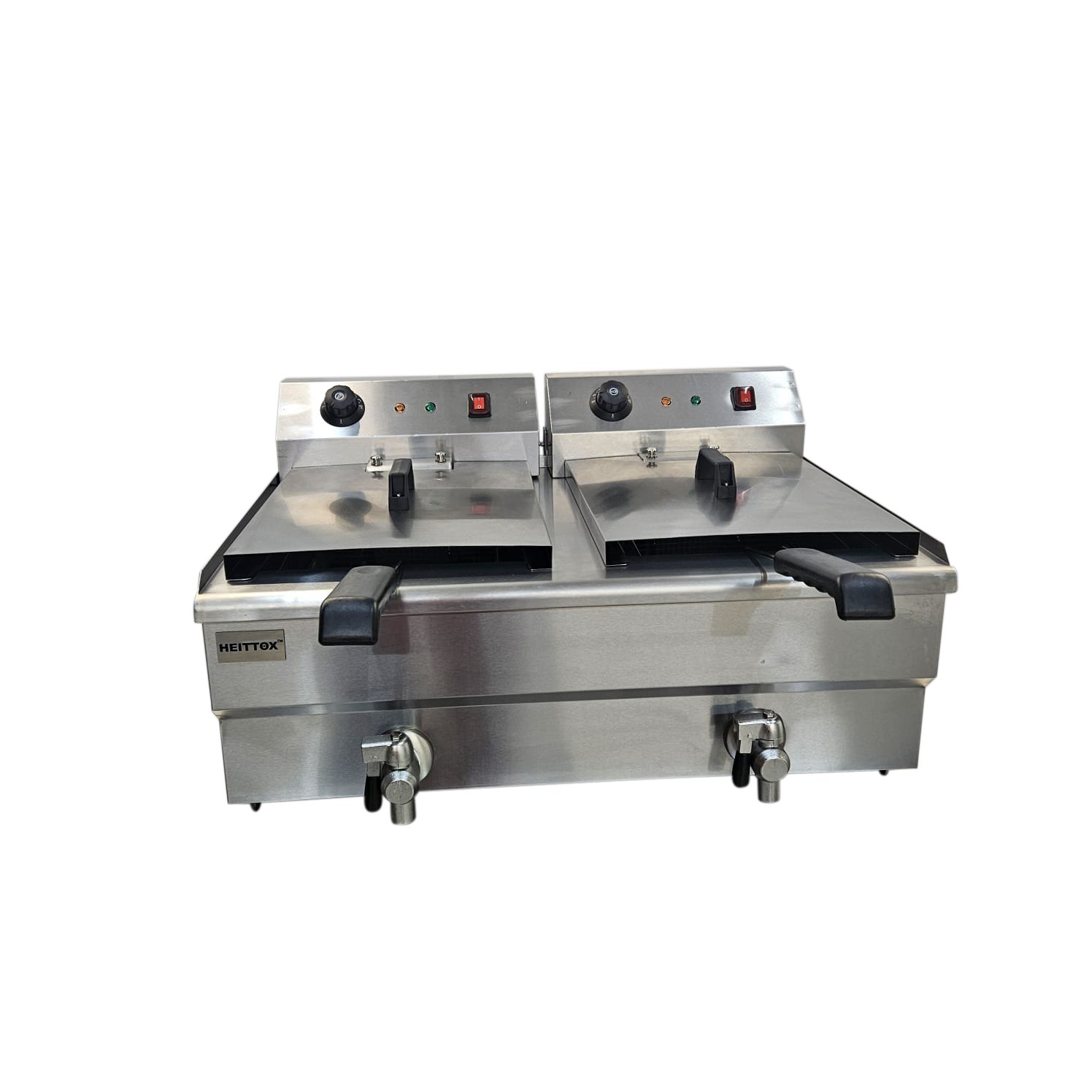 The Heittox double 16L tabletop fryer is a powerful and compact appliance designed for professional kitchens with limited space. With a 11L per tank oil capacity, precise temperature control, and a durable stainless steel construction, this fryer is perfect for cooking up crispy and delicious fried foods efficiently.
